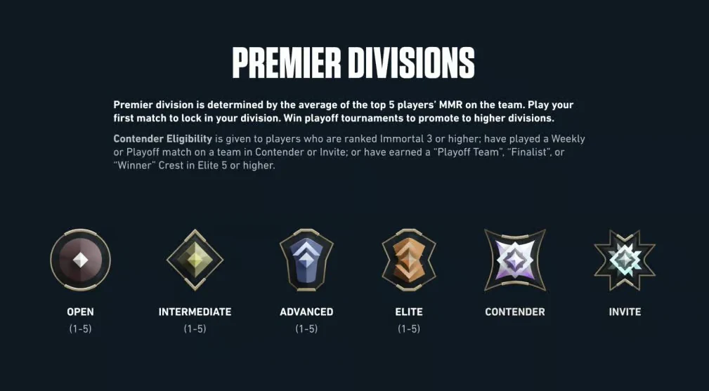 團隊根據頂級球員的技能水平分為不同的組別5 名玩家。各部門是打開,中間的,先進的,精英,競爭者, 和邀請。從公開賽到精英賽,每個級別都有五個級別。邀請是頂級師。在邀請賽中獲勝可以獲得參加挑戰者聯賽的機會,並有希望參加錦標賽《VALORANT》冠軍巡迴賽。