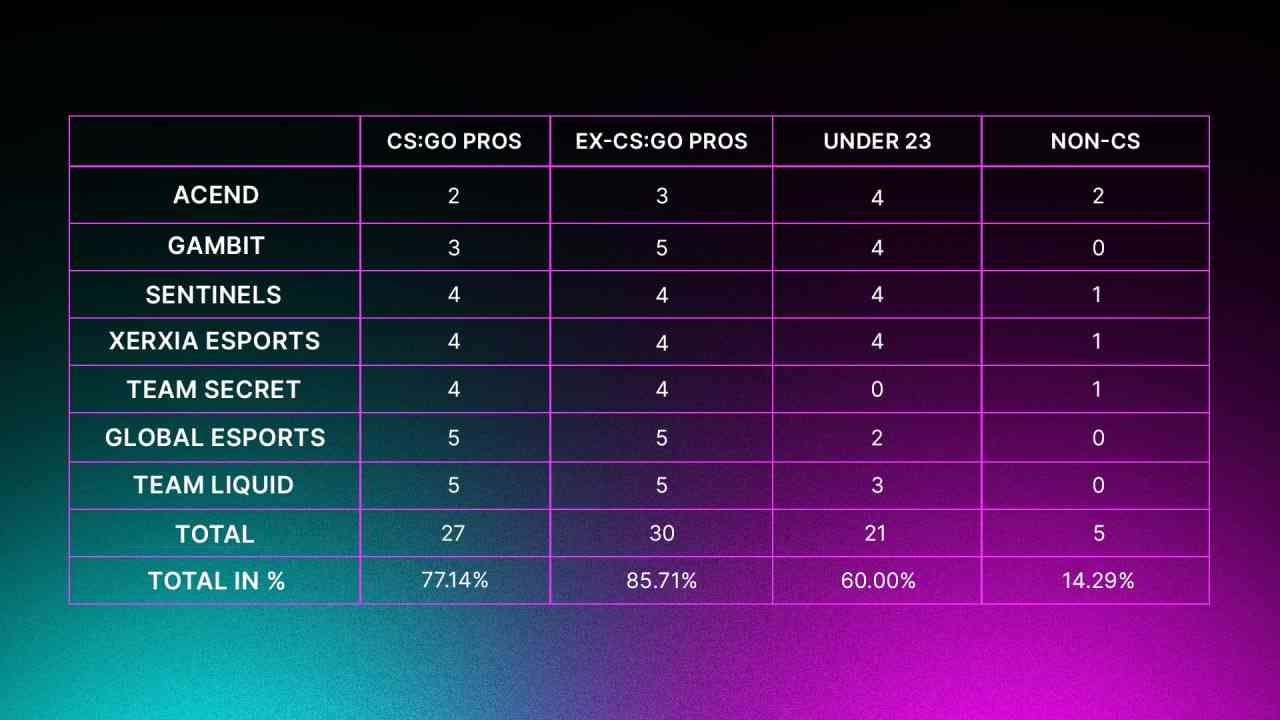 Velocity Gaming、Full Sense 和 Global Esports 等團隊擁有完整的前 CS 職業名單。 PRX 等其他團隊傾向於使用 CS:GO 核心,並從其他遊戲中導入一到兩個內容。