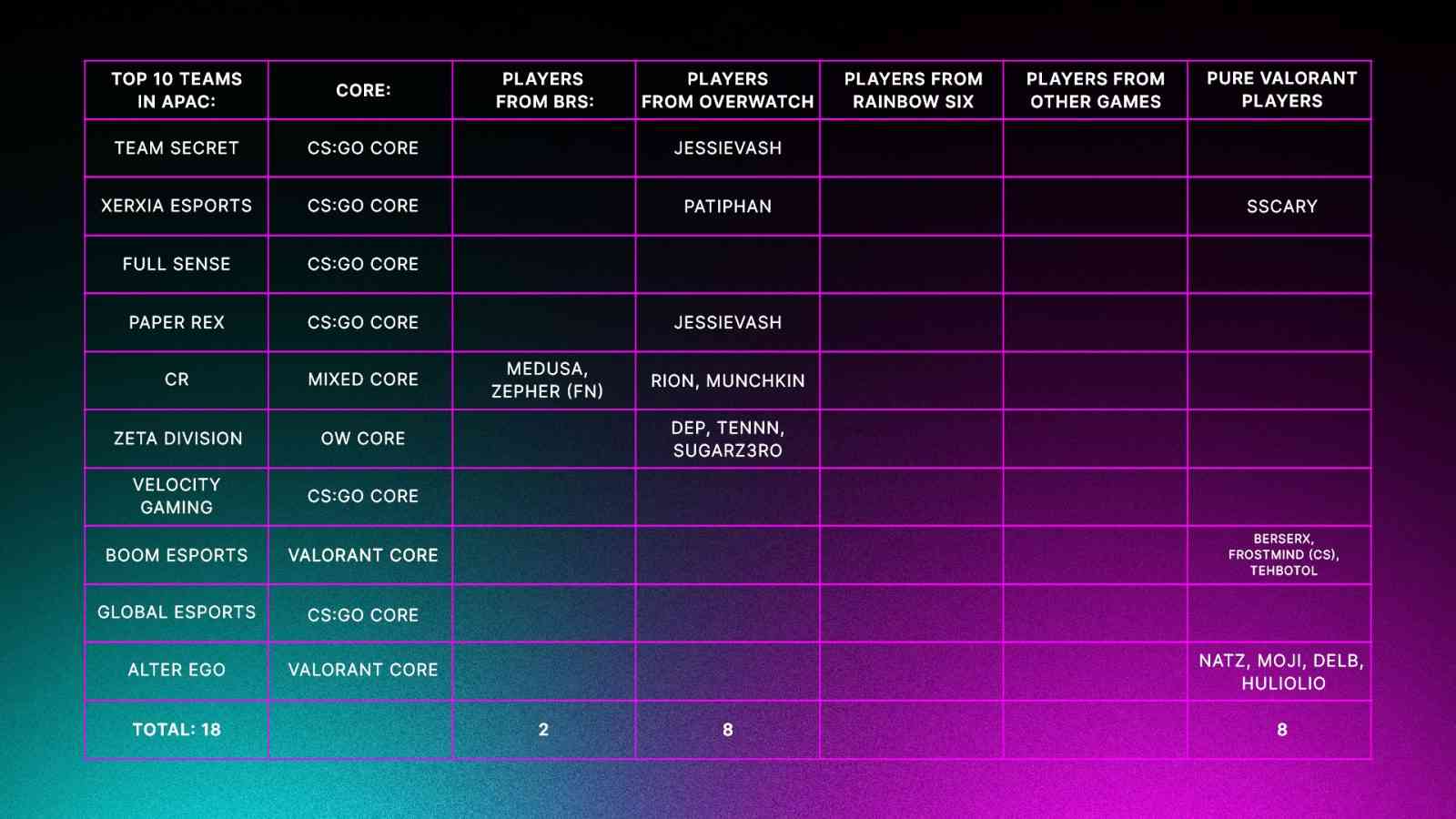 SEA 也是唯一一個擁有純 VALORANT 核心隊伍進入前十名的賽區。前十名中有兩支隊伍擁有 VALORANT 核心。