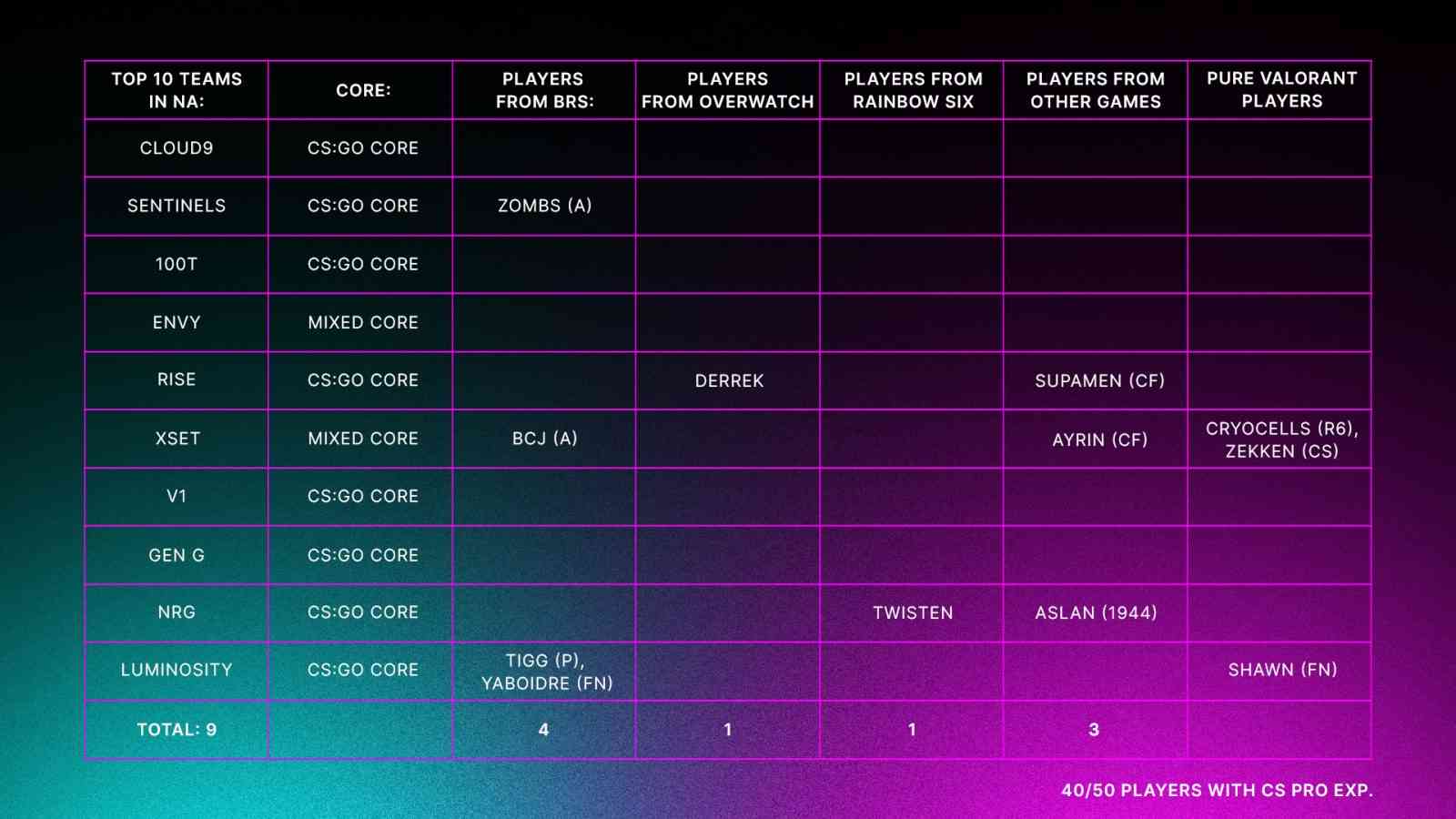 北美地區可能有 50 名職業 CS 背景的玩家,其中 40 名是令人震驚的。這些數字表明競爭由越來越多的老牌玩家組成。只有 3 名玩家是純粹的 VALORANT 玩家,沒有任何職業經驗,而歐洲有 12 名。