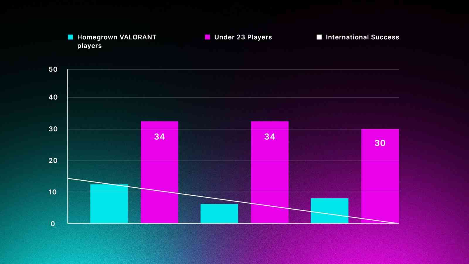 歐洲和東南亞一直走在為年輕球員提供展示才華的機會的前沿。分別有 12 名和 8 名 Pure VALORANT 玩家。這分別佔歐洲和東南亞頂級隊伍人才庫中至少 24% 和 16% 的人才以《VALORANT》作為他們的第一位職業射手。