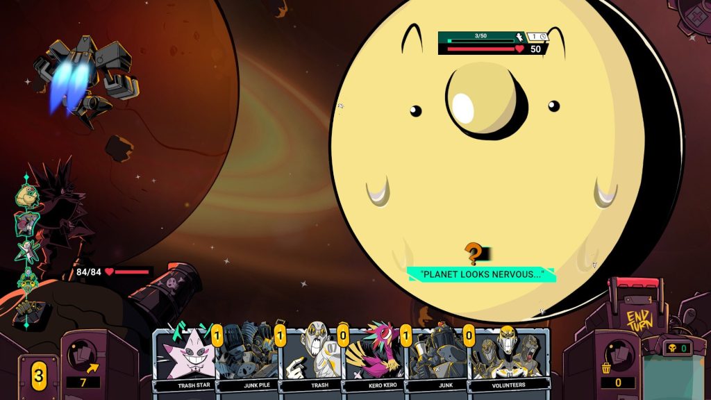 這款遊戲如此出色的另一個原因是什麼?它利用了一些我覺得很有趣的非常獨特的機制。您的大部分卡片都分為垃圾卡和垃圾卡。雖然這聽起來像是同一件事,但事實並非如此。垃圾卡是合成人類,而垃圾卡是太空碎片。一般來說,垃圾可以提供防禦提升,而垃圾則有幾個目的。如果你向敵人發射垃圾,你會先削弱他們的護盾。一旦這些消失,垃圾就會被用來填充敵人,一旦他們的人口計滿了,那個敵人就會變得交錯,在一個受祝福的回合中無法做任何事情。