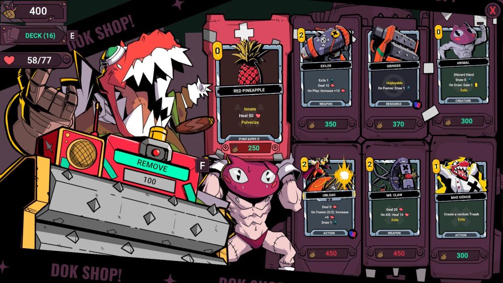 你還會發現祭壇,在那裡你可以犧牲卡牌來獲得新的卡牌,灰色市場可以讓你交易單張卡牌,在廢棄的實驗室中將你的垃圾變異成新的形式,打破東西以獲得更多的太空垃圾,甚至用菠蘿餵飢餓的太空龍。我應該提到的是,遊戲中的菠蘿是貨幣,主要用於在 Dok 商店購買東西。或者您可能更願意向令人討厭的流星許願或參加遊戲節目?有很多事情可以改變你的跑步軌跡,而這還是在 Raw Fury 和 OTA IMON Studio 於 7 月 18 日推出大規模更新之前發生的事情。